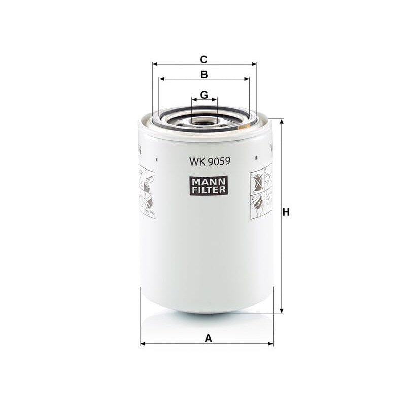 Dalies numeris WK9059 EAN4011558086664 Vnt./vnt. Gamintojas MANN-FILTER Išsamus aprašymas Kuro filtrai Tvirtinimo sriegio skersmuo 3/4 colio Tvirtinimo sriegio apvijų skaičius colyje 16 Tvirtinimo sriegio tipas UN-2B Ilgis 133 mm Išorinis skersmuo 93 mm Vidinis skersmuo 63 mm 71 mm Sandarinimo išorinis skersmuo 71 mm Sandarinimo vidinis skersmuo 63 mm