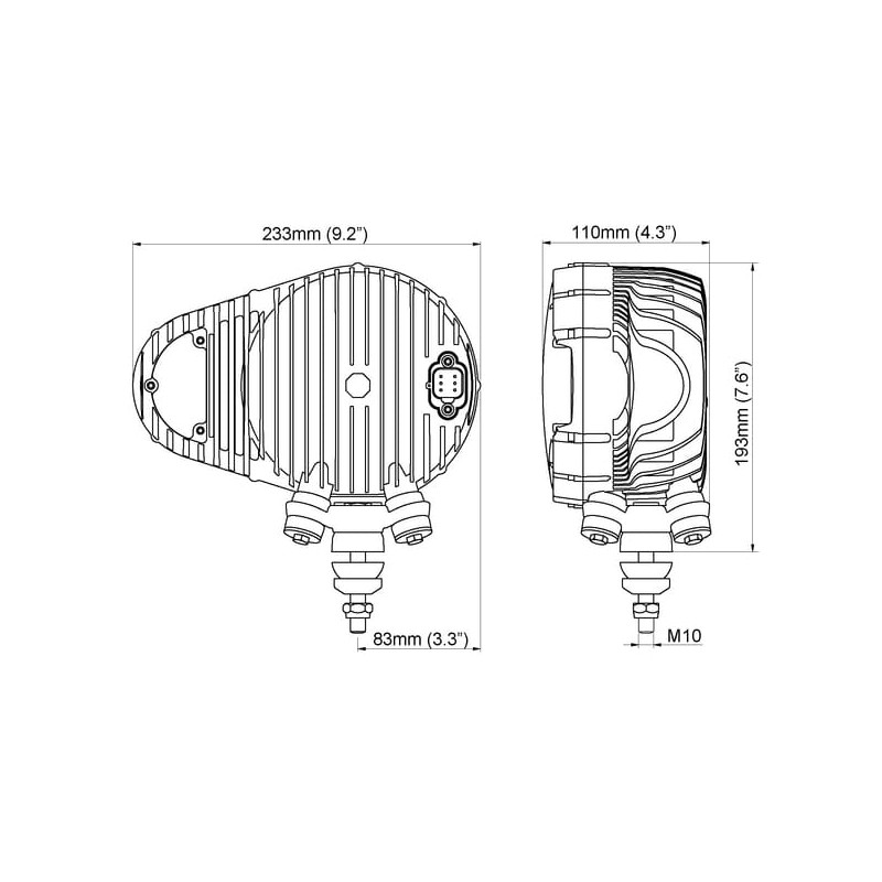 Priekinių žibintų šviesos diodas, dešinysis ovalus, 12/24V, skaidrus, prisukamas, 233x110x193mm, Deutsch 6 kontaktų, Dviejų spin