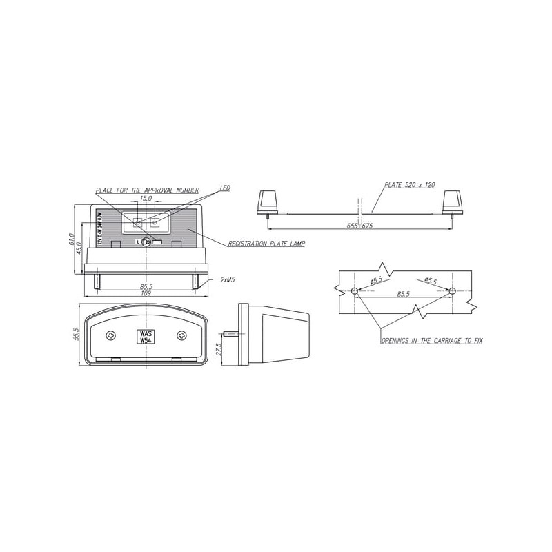 Valstybinio numerio apšvietimas LED, stačiakampis, 12/24V, skaidrus, užsukamas, 109x55x61mm, Waś 1400300453