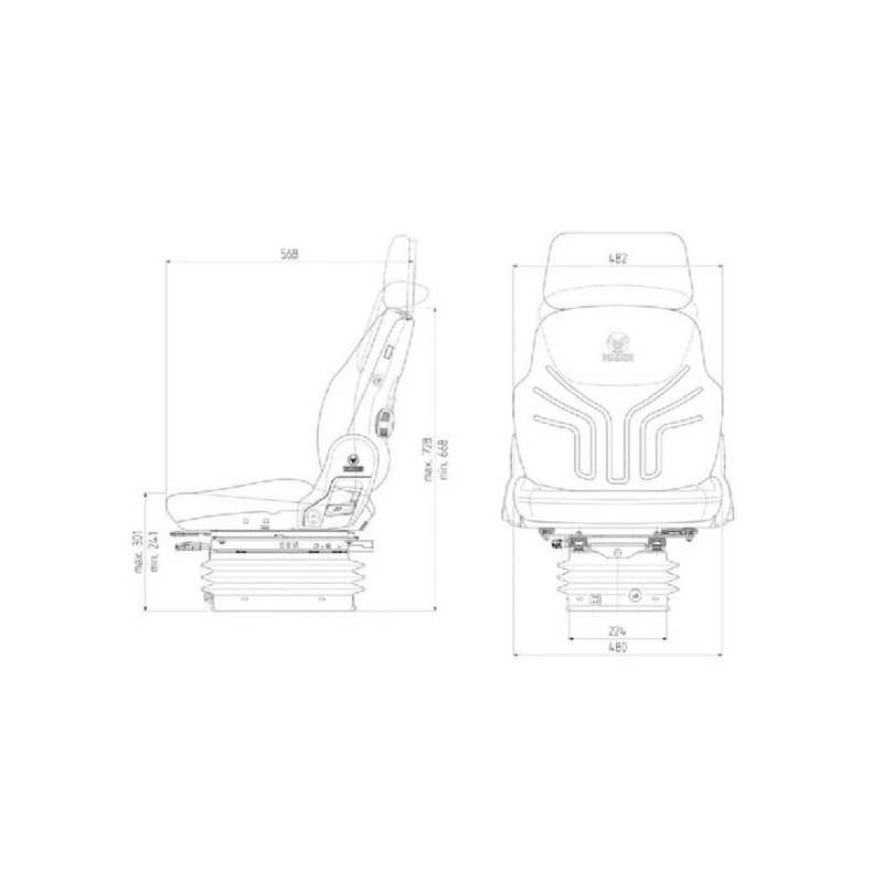 Ilgas aprašymas Taikymo sritis: Mažiems ir siaurų tarpvėžių traktoriams, statybinėms mašinoms ir mini ekskavatoriams Privalumai: Optimalus sėdynės patogumas mažiausiose erdvėse Nevargina darbas dėl reguliuojamos juosmens atramos Sudedamosios dalys: Sėdynė su kompresoriumi Su išilgine horizontalia pakaba Be porankių atramų Be atlošo prailginimo Oro atramų be atlošo išplėtimo Oro atramų be atlošo pailginimo detalių: 4 horizontaliu oro kompresoriumi pakaba, blokavimas Savybės: Sėdynės pagalvėlės plotis 480 mm Spyruoklės eiga: 80 mm Aukščio reguliavimas 60 mm, be pakopų Horizontalus reguliavimas 180 mm Automatinis, oro pagalba svorio reguliavimas 50–130 kg Svoris 32 kg Atlošo pasvirimo reguliavimas Juosmens atrama, mechaniškai reguliuojama