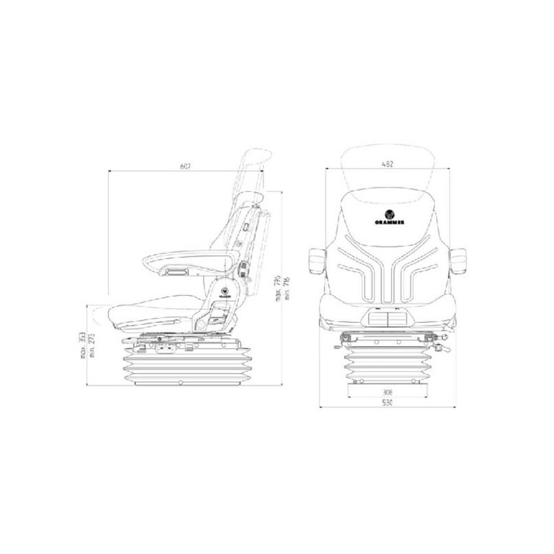 Savybės Sėdynės pagalvėlės plotis 530 mm Spyruoklės eiga: 100 mm Aukščio reguliavimas 60 mm, be pakopų Su mechaniniu stuburo disko atrama APS: automatinė padėties nustatymo sistema Sėdynės pagalvėlės gylio ir pasvirimo reguliavimas