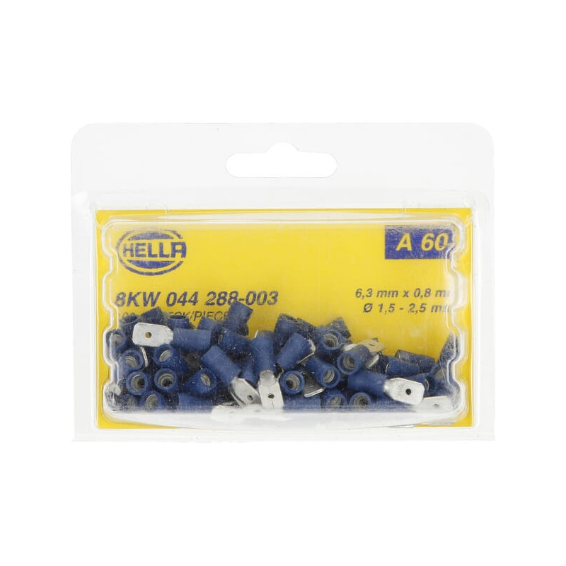 Gnybtų mentė vyriška, mėlyna, 1,5–2,5 mm² 6,3 x 0,8 mm, lizdinė plokštelė (100x), Hella 8KW044288003