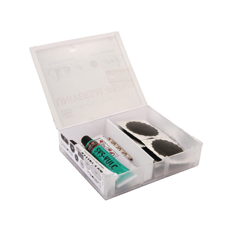 Susideda iš 3 x 1 dydžio pleistro 3 x 2 pleistro dydžio 1 x 7 dydžio 1 x vulkanizavimo skysčio 5 g vamzdelio 1 x guminių gaminių taisymo vadovo 2 x CAMPLAST pleistrų apytiksl. Ø 35 mm 2 x CAMPLAST pleistrai apytiksl. Ø 45 mm 1 x CAMPLAST pleistras apytiksl. 73 x 38 mm 1 x CAMPLAST cementas 6 g vamzdelis 2 x švitrinis popierius 1 x CAMPLAST remonto vadovas