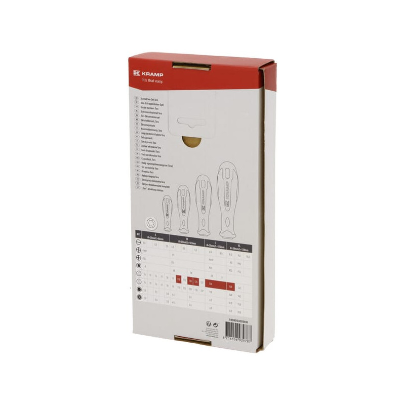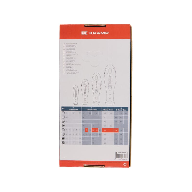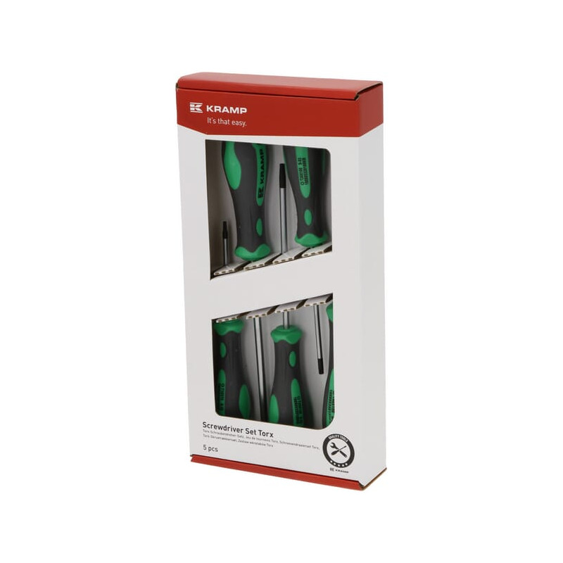 Dalies numeris 1808053005KR EAN8716106939787 VienetasRinkinys Gamintojas Kramp Išsamus aprašymas 5 profesionalių „Torx“ atsuktuvų rinkinys su ergonomiška rankena, pagaminta iš dvigubo kompozito plastiko, užtikrinančio optimalų galios perdavimą. Rankenos yra spalvotai koduojamos, kad būtų galima greitai atpažinti tinkamą atsuktuvą. PrivalumaiDviejų komponentų rankena, kuri neleidžia atsuktuvo rankenai slysti riebaluotose rankoseAšmenų galas yra apdirbtas ir įmagnetintasPuiki apsauga nuo korozijos, nesusidaro rūdys Puikiai ašmenys priglunda prie varžto galvutėsDidelis sukimo momentasGeras naudojimo pojūtis