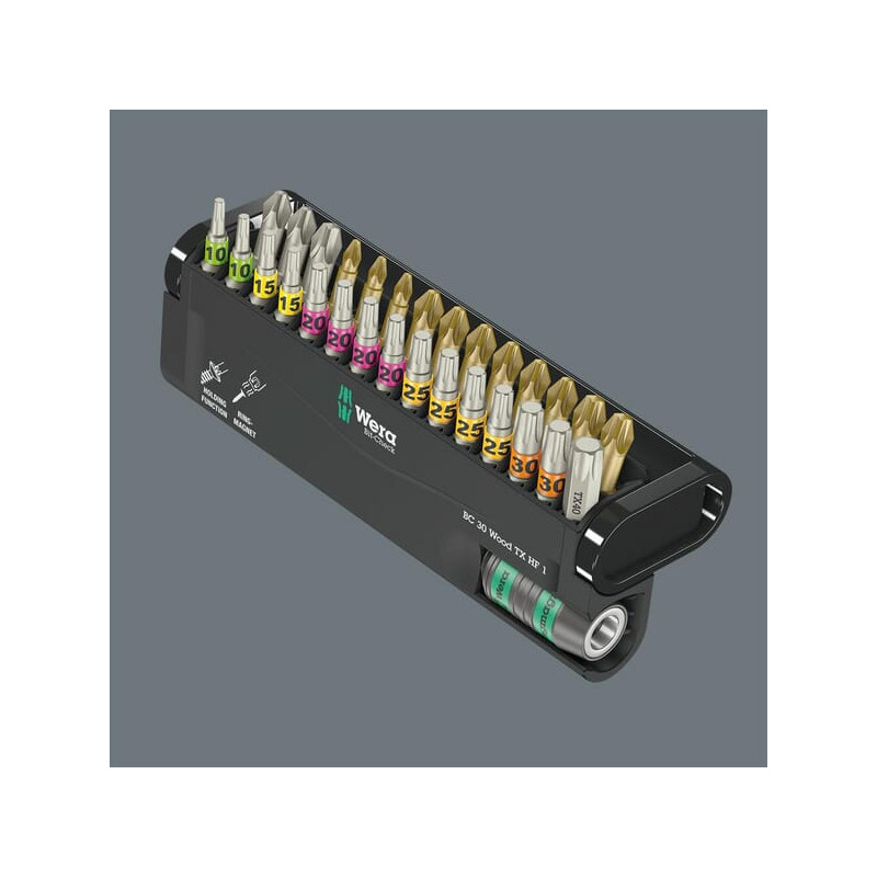 Įeina: 887/4 RR „Rapidaptor“ universalus antgalių laikiklis su žiediniu magnetu: 1 x 1/4 colio x 57 mm. 851/1 TZ antgaliai „Phillips“: 2 x PH2, 1 x PH3 (25 mm ilgio). 855/1 TH antgaliai „Pozidriv“: 3 x PZ1, 6 x PZ2, 2 x PZ3 (25 mm ilgio). 867/1 TORX® HF antgaliai su laikymo funkcija: 2x TX10, 2x TX15, 4x TX20, 4x TX25, 2x TX30, 1x TX40 (ilgis 25 mm) Pavaros dydis 1/4 colio Pavaros profilis 6 kampų Komponentų skaičius 30 Standartinis veržliarakčio dydis PH2 PH3 PZ1 PZ2 PZ3 TX10 TX20 TX30 Ilga versija Ne Smūgio tipas Ne Bendras ilgis 25 mm
