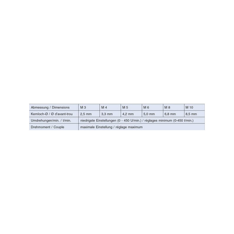 Dalies numeris TAS3 EAN4022835670261 Vnt./vnt. Gamintojas Völkel Sriegio tipas Metrinis Sriegio skersmuo M3 Sriegio žingsnis 0,50 mm L2 Sriegio ilgis 11 mm Sriegio kryptis Dešinė L1 Bendras ilgis 11 mm Srieginės skylės skersmuo 2,5 mm Koto kvadratinis plotis 6,3 mm Medžiaga Plienas HSS-G Tipo kodas D []