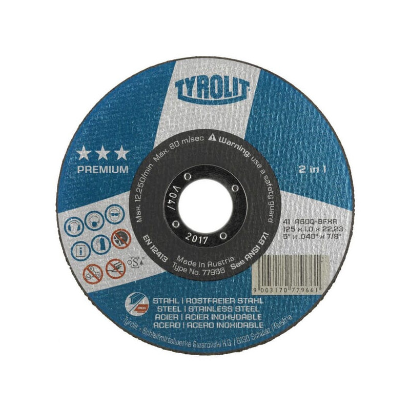 Dalies numeris 872348 EAN9003178723482 Vnt./vnt. Gamintojas Tyrolit Taikymo sritis Plienui ir nerūdijančiam plienui Kampiniams šlifuokliams Savybės Paprastas 2 viename šlifavimo diskas su plokštelėmis Geras apdirbimas Ilgas tarnavimo laikas Išsamus aprašymas Taikymas: Plienui ir nerūdijančiam plienui Kampiniams šlifuokliams Savybės: Paprastas 2 viename šlifavimo diskas su plokštelėmis Geras apdirbimas Ilgas tarnavimo laikas Disko skersmuo 125 mm Disko tvirtinimo angos skersmuo 22,23 mm Storis 3 mm Skirta medžiagai Nerūdijantis plienas Plienas Formos kodas 42 Grūdėtumo kodas 30 Maks. sukimosi greitis 4800 aps./min. Maks. sukimosi greitis 80 m/s []