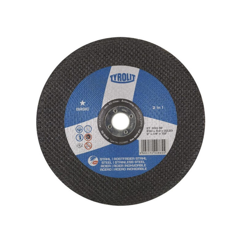 Dalies numeris 222858 EAN9003172228587 VienetasKiekvienas Gamintojas Tyrolit Išsami informacija Minimali vibracija Agresyviam ir sklandžiam apdirbimui Taikymo sritis Plienui ir nerūdijančiam plienui Šlifuoti kraštus, paviršius ir suvirinimo siūles Kampiniams šlifuokliams Savybės Pagrindinis 2 viename šlifavimo diskas Kietumas Q Šlifavimas 20–30° kampu Privalumai Lengva dirbti, ergonomiška Greitesnis medžiagos pašalinimas trumpesniu šlifavimo laiku Išsamus aprašymas Taikymas: Plienui ir nerūdijančiam plienui Šlifuoti kraštus, paviršius ir suvirinimo siūles Kampiniams šlifuokliams Privalumai: Lengva dirbti, ergonomiška Greitesnis medžiagos pašalinimas trumpesniu šlifavimo laiku Išsami informacija: Minimali vibracija Agresyviam ir sklandžiam apdirbimui Savybės: Pagrindinis 2 viename šlifavimo diskas Kietumas Q Šlifavimas 20–30° kampu Disko skersmuo 115 mm Disko tvirtinimo angos skersmuo 22,23 mm Storis 6 mm Skirta medžiagai Nerūdijantis plienas Plienas Formos kodas 27 Grūdėtumo kodas 30 Maks. Sukimosi greitis 4320 aps./min.