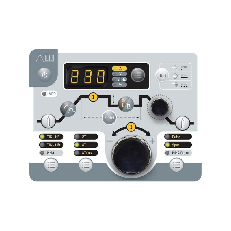 Produkto informacijaAutomatinis degiklio aptikimas Tinka naudoti su degikliais su plokštelėmis, dviguba rankenėle, sukamąja rankenėle ir aukštyn/žemyn suvirinimu Bazinių ir rutilinių suvirinimo strypų, kurių skersmuo iki 5 mm, suvirinimas 2T, 4T ir 4T LOG paleidimo režimai Rodo srovę ir įtampą suvirinimo metu ir po jo Atmintis iki 50 programų vienai procedūrai Tinka naudoti su maitinimo kabeliu iki 100 metrų Apsaugota nuo įtampos šuolių iki 400 V Jungtys nuotolinio valdymo pultui (rankinis arba pedalas) VRD galima įjungti vidiniu jungikliu, kad sumažėtų išėjimo įtampa be apkrovos