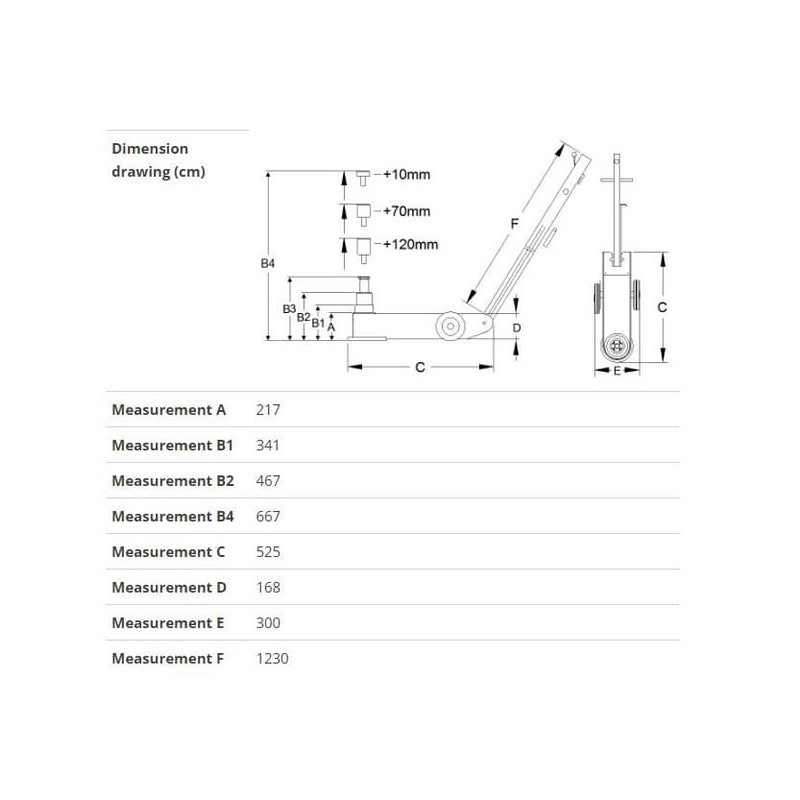 Papildoma informacijaDomkratas turi greito kėlimo ir nuleidimo funkciją, o spyruoklinė nuleidimo sistema turi avarinį jungiklį. Dėl aukščio jį galima naudoti žemesnėse situacijose. Domkratas tiekiamas su dviem priedais – 50 ir 100 mm.