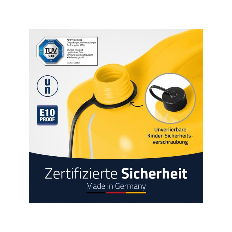 Produkto informacijaTÜV patikrinta gamybaTinka etanolio kurui E10Integruota peržiūros juostelė su reljefine skale leidžia tiksliai ir lengvai nuskaityti užpildymo lygį - Įskaitant snapelį ir nenuimamą vaikų saugos užsukamąjį dangtelį