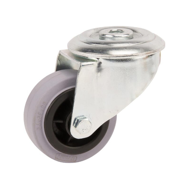 Techninė informacijaPasukamas ratukas, korpusas pagamintas iš presuoto plieno, blizgaus cinkavimo, mėlynai pasyvuotas, dvigubas rutulinis guolis pasukama galvute, rato ašis su veržle, varžto skylė. Ratuko centras pagamintas iš polipropileno, Padangos: pilka, nepaliekanti žymių, vientisa guma, ritininis guolis