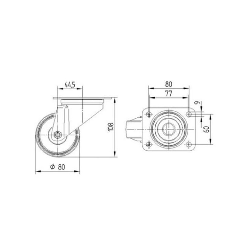 Pasukamas ratukas, poliamidinis ratas: Ø80x34mm, plokštelės tvirtinimas: 105x85mm. Apkrova: 200kg, Tente 3470UOJ080P62.