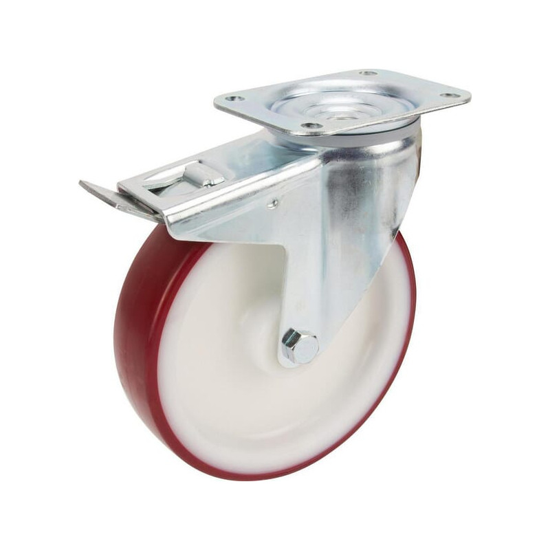 Techninė informacijaPasukamas ratukas su visišku užraktu, ratuko galas, korpusas pagamintas iš presuoto plieno, blizgaus cinkavimo, mėlynai pasyvuotas, dvigubas rutulinis guolis pasukama galvute, rato ašis su veržle, apsauga nuo dulkių, plokštelinis tvirtinimas. Ratuko centras pagamintas iš poliamido, Padanga: poliuretanas, Ritininis guolis