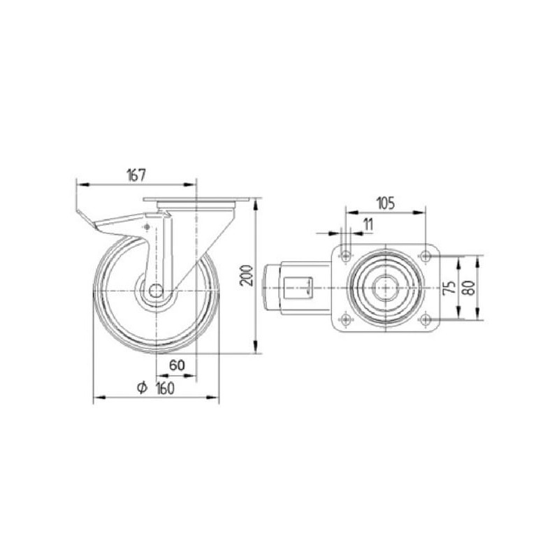 Pasukamas ratukas, poliuretano ratas: Ø160x40mm, su stabdžiu, plokštelės tvirtinimas: 137x105mm, apkrova: 350kg, Tente 3477UAR16