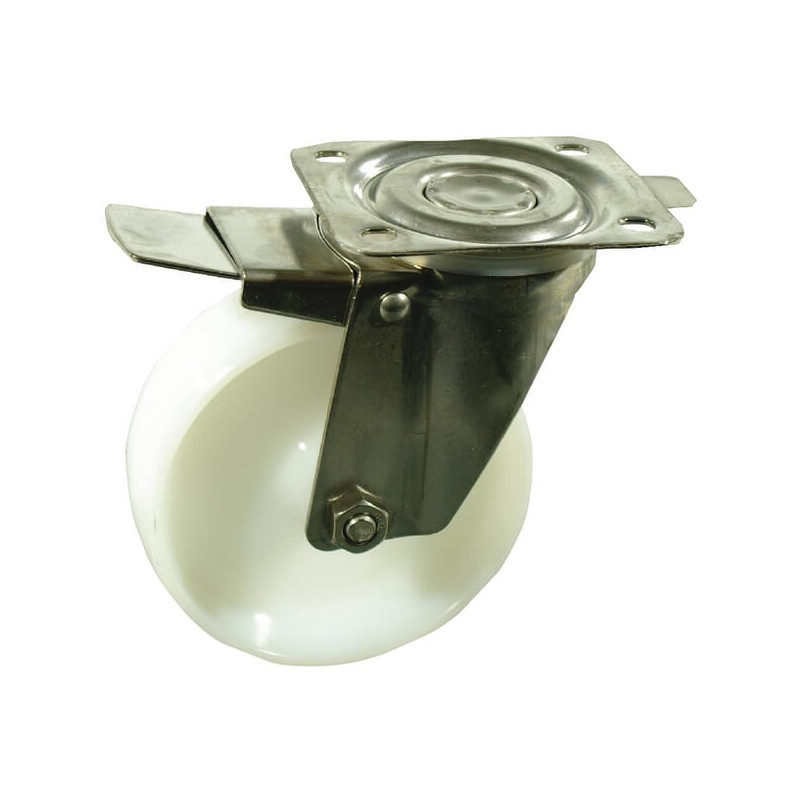 Pasukamas ratukas, poliamidinis ratas: Ø80x30mm, su stabdžiu, nerūdijančio plieno plokštės tvirtinimo detalė: 105x85mm. Apkrova: