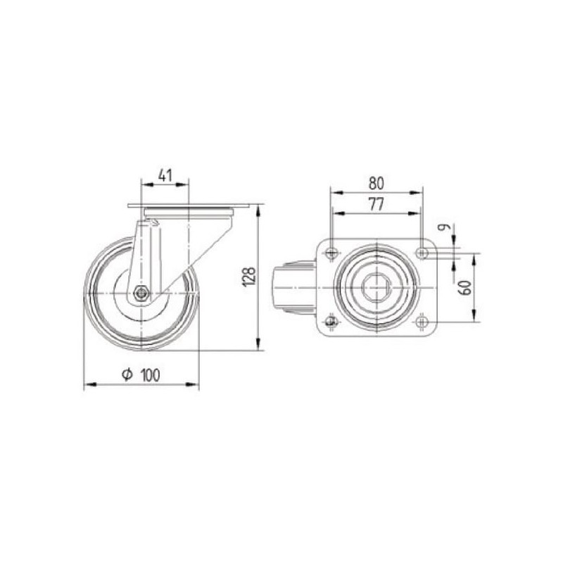 Techninė informacija Pasukamas ratukas, dvigubas rutulinis guolis, rato ašis su veržle, plokštelės tvirtinimas. Ratuko centras pagamintas iš poliamido, Padanga: poliuretanas, violetinė, ritininis guolis, nerūdijantis plienas