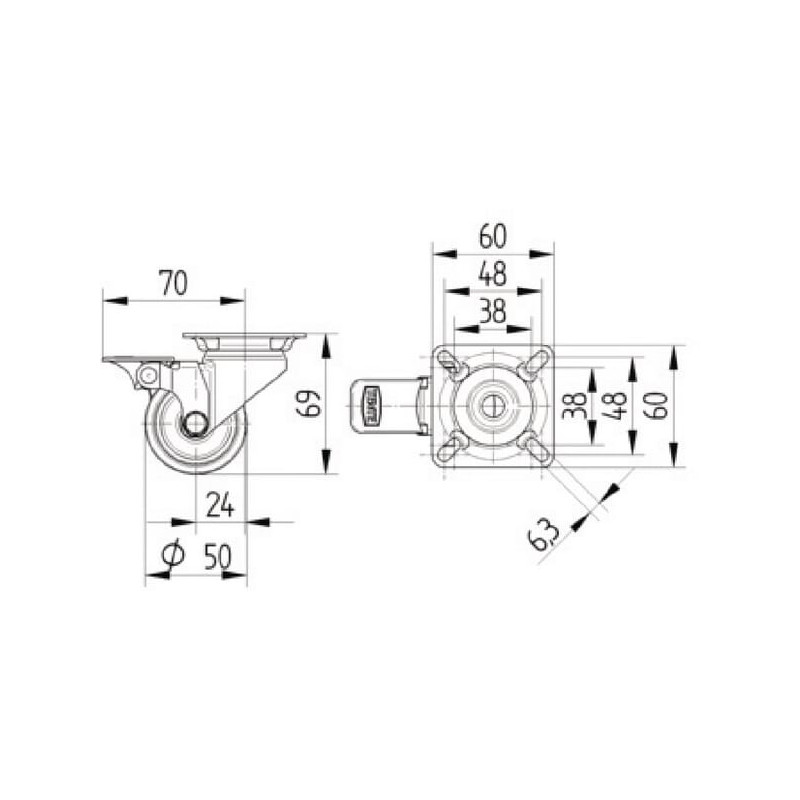 Pasukamas ratukas, guminis ratas: Ø50x19mm, su stabdžiu, nerūdijančio plieno plokštės tvirtinimas: 60x60mm. Apkrova: 50kg, Tente