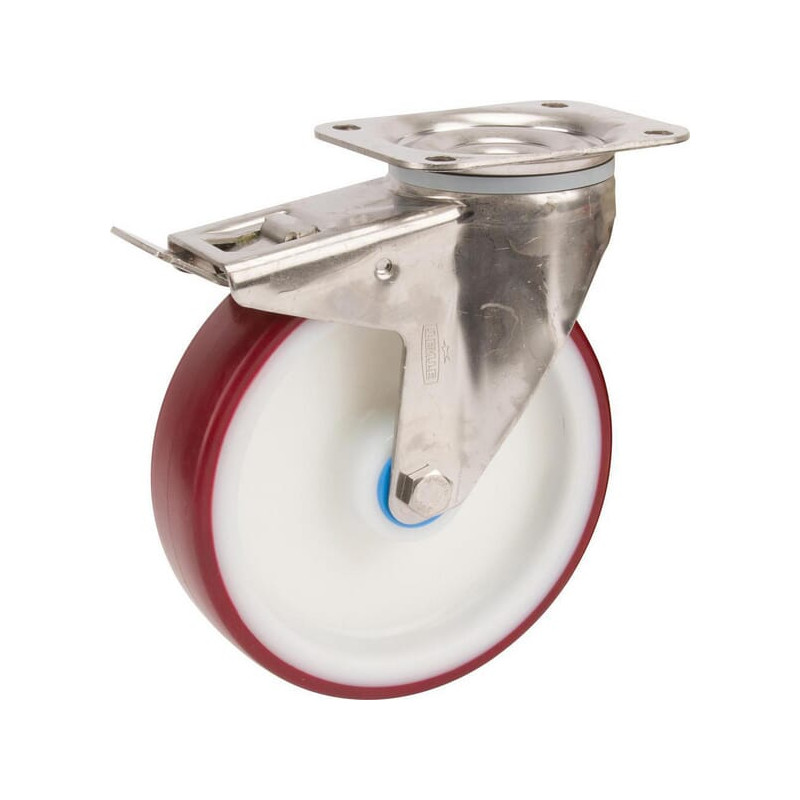 Pasukamas ratukas, poliuretano ratas: Ø125x32mm, su stabdžiu, nerūdijančio plieno plokštės tvirtinimas: 105x85mm. Apkrova: 200kg