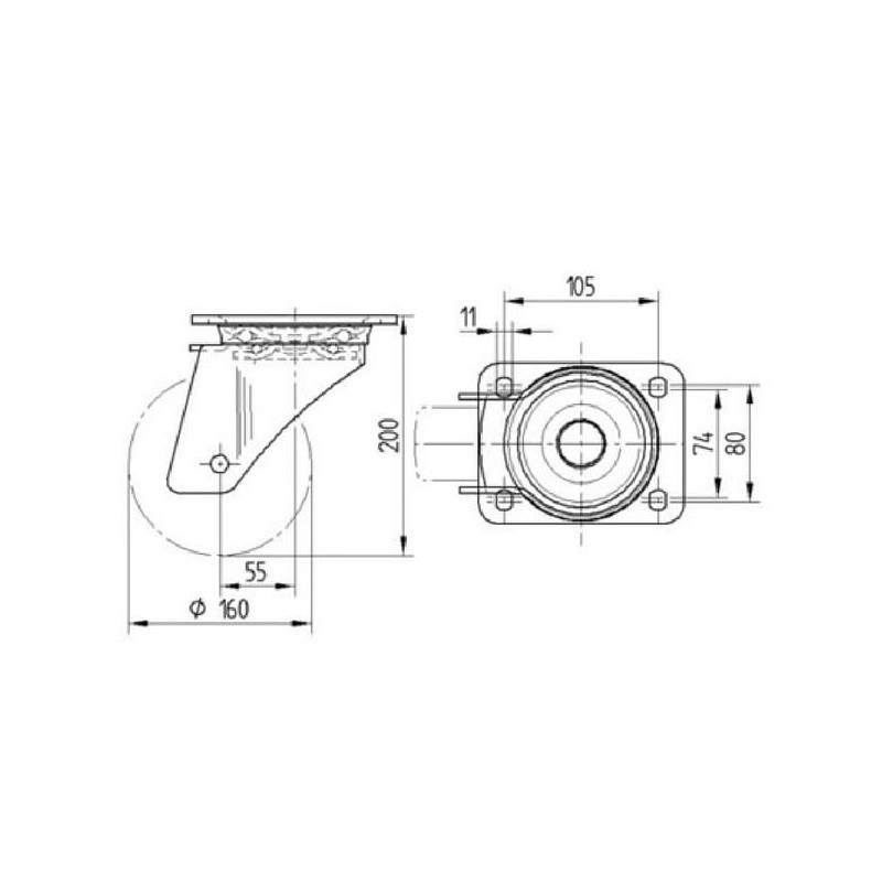 Pasukamas ratukas, guminis ratas: Ø160x50mm, plokštelės tvirtinimas: 137x105mm. Apkrova: 350kg, Tente 4680IEP160P63.