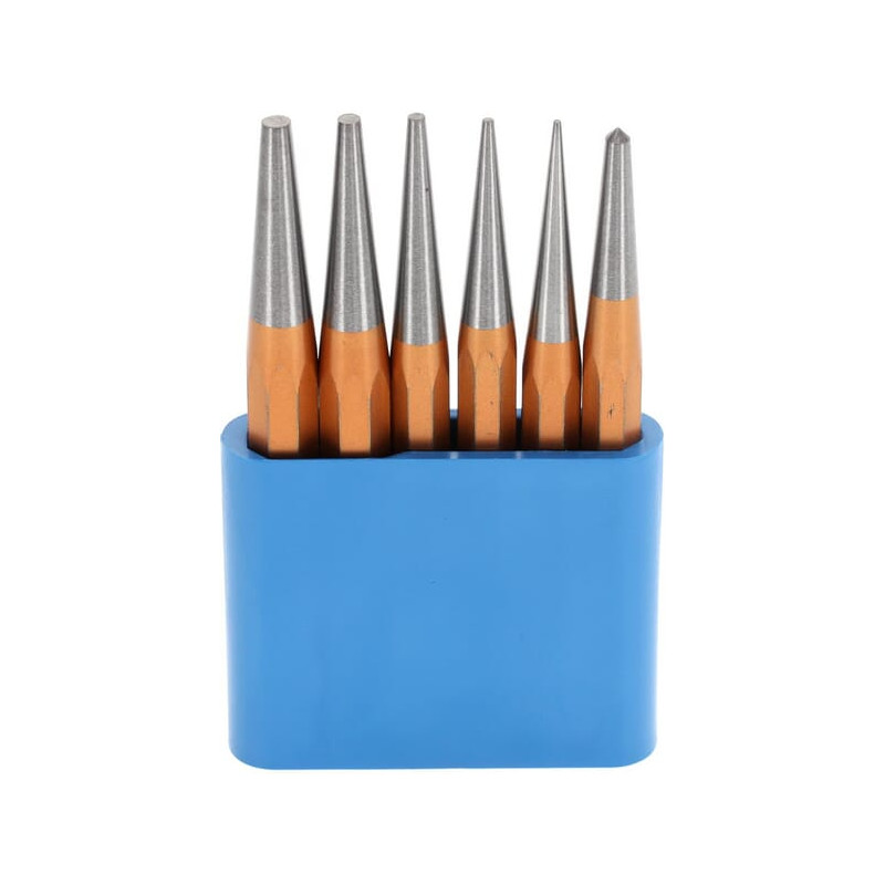 Skersmuo 1 mm 2 mm 3 mm 4 mm 5 mm 10 mm Parduodamo vieneto turinys 6 vnt. Medžiaga Chromo molibdeno plienas Bendras ilgis 125 mm Sudėtyje yra: Pramuštuvas su 10 mm aštuonkampiu velenu: HG99- 101 - 102 - 103; Pramuštuvas su 12 mm aštuonkampiu velenu: HG99- 124 - 125; Centravimo skylmušas su 10 mm aštuonkampiu velenu: HG-10010; PVC laikiklyje Pramuštuvų skaičius 6 Tiesių kaltų skaičius 0 V formos kaltų skaičius 0 Pusapvalių kaltų skaičius 0 Plokščių kaltų skaičius 0 Smailių kaltų skaičius 0 Su centriniu skylmušu Ne Koto forma Aštuonkampis Pakuotės tipas Plastikinis laikiklis Svoris 460 g Gamintojo prekės ID 8753680 []