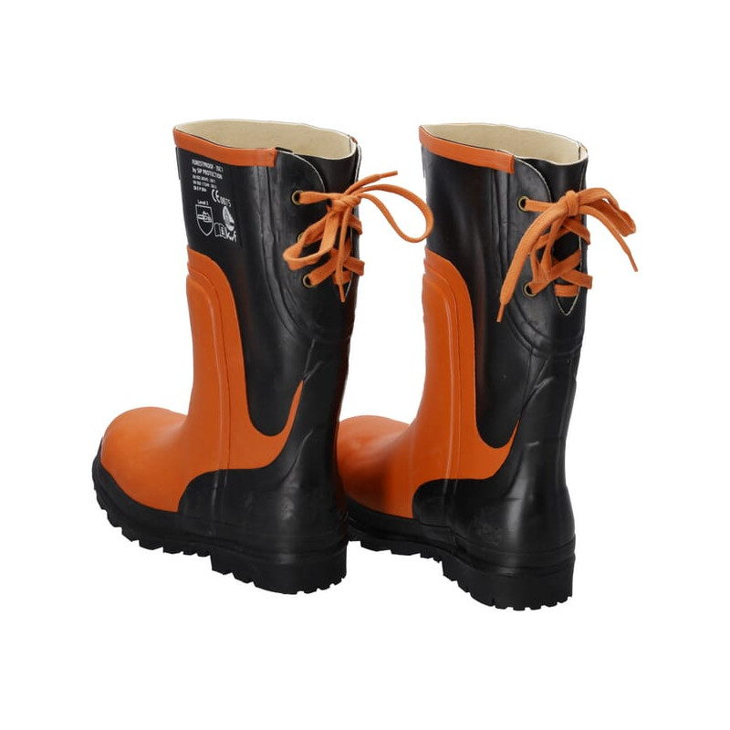 Išsamus aprašymas 100 % vandeniui atsparūs guminiai batai su 3 klasės apsauga nuo grandininių pjūklų. Puikus padas užtikrina gerą sukibimą su purvinu reljefu, o raišteliai blauzdų aukštyje užtikrina lengvą apsiavimą.