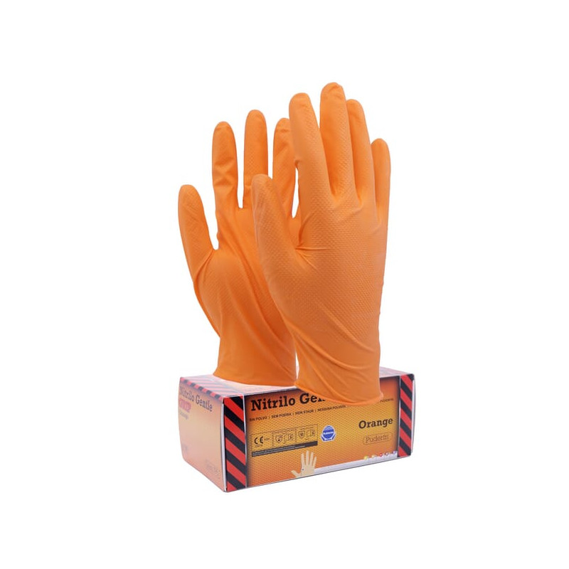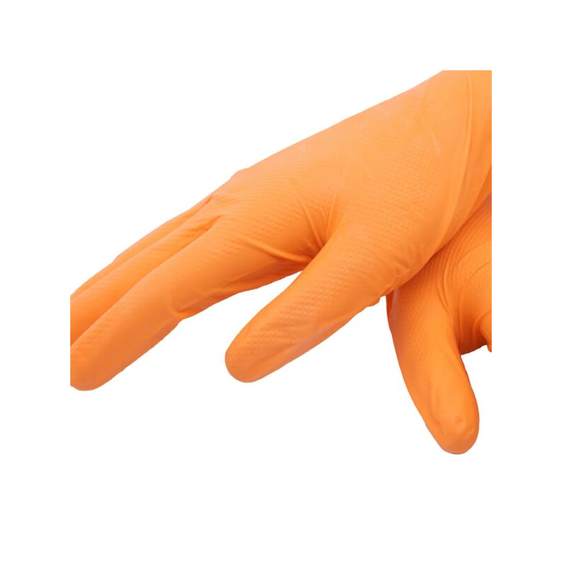 Išsamus aprašymasPatvarios oranžinės spalvos vienkartinės nitrilinės pirštinės – geras matomumas ir puikus sukibimas. Šios patvarios oranžinės spalvos nitrilinės pirštinės yra ypač storos ir gerai matomos. Iškeltas rombo formos sukibimo raštas užtikrina saugų sukibimą. Jos yra be pudros, be silikono ir ergonomiškai suprojektuotos, kad puikiai priglustų ir padidintų jautrumą. Pasižymi dideliu atsparumu cheminėms medžiagoms, ypač aliejams, riebalams ir naftos pagrindu pagamintoms cheminėms medžiagoms, jos taip pat yra patvirtintos naudoti maisto produktuose.