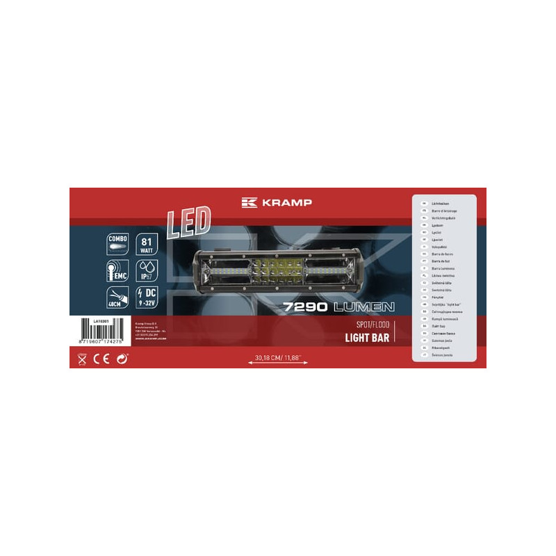 Darbinio šviesos diodo juosta, 81 W, 7290 lm, stačiakampė, 12/24 V, balta, 301,8 x 89 mm, kabelis, komplektas, 54 LED, Kramp LA1