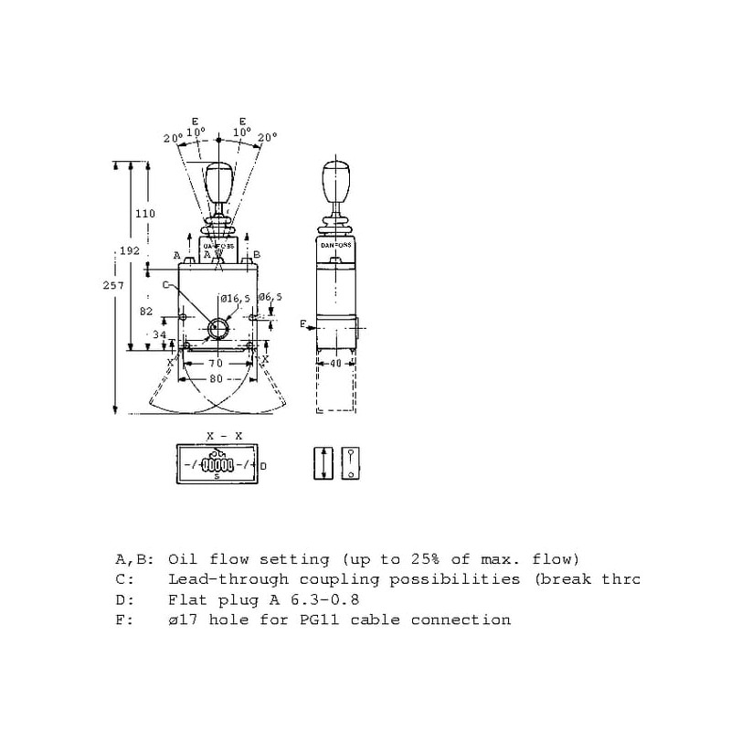 Produkto informacijaĮtampos diapazonas UDC: 11–30 UDCSrovės suvartojimas: < 80 mAI Išėjimo įtampa Us: 0,25–0,75 UDCNuolaidinė įtampa Us: 0,5Maksimali signalo srovė UDC = 12 V ± 0,6 mAMaksimali signalo srovė UDC = 24 V ± 1,2 mAApsaugos laipsnis: IP 44PVRES 155B4211 turi du nepriklausomus srauto reguliatorius (potenciometrus), kurie riboja srautą iš proporcinio vožtuvo į A ir B jungtis, nepaveikdami maksimalios eigos. Srautas gali būti apribotas iki 25 % viso srauto, išlaikant visą rankenos eigą.