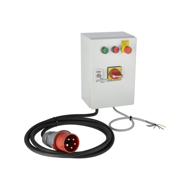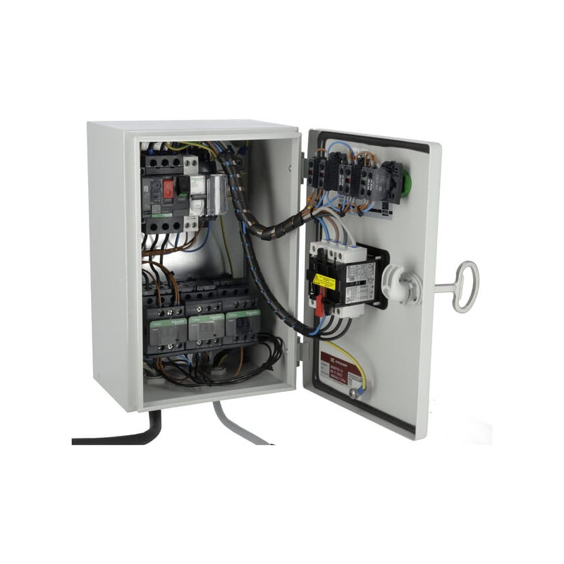 Papildoma informacijaValdymo dėžutė įjungimas/išjungimas, automatinis žvaigždės-trikampio perjungimas 5 metrų kabelis su kištuku 32A 5P B000227 Variklis išsijungia nutrūkus elektros tiekimui Nėra fazių sekos arba fazių gedimo apsaugos, todėl pirmojo paleidimo metu patikrinkite sukimosi kryptį
