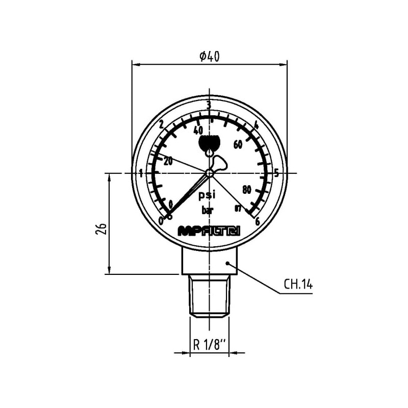 Vizualinis manometras 1/8 BSP, 1,4 baro MPF/MPX/MPT/MPH MP9V1P01