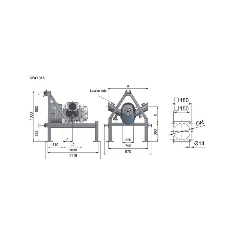 SudėtisSudaro: Rotacinis kumštelinis siurblysCinkuotas trijų taškų rėmasVarantysis velenas (1 3/8 colio, 6 dalių, traktoriaus pavarai) su perkrovos apsaugos įtaisuPTO apsauginis dangtelis2 jungiamieji vamzdžiai su flanšais
