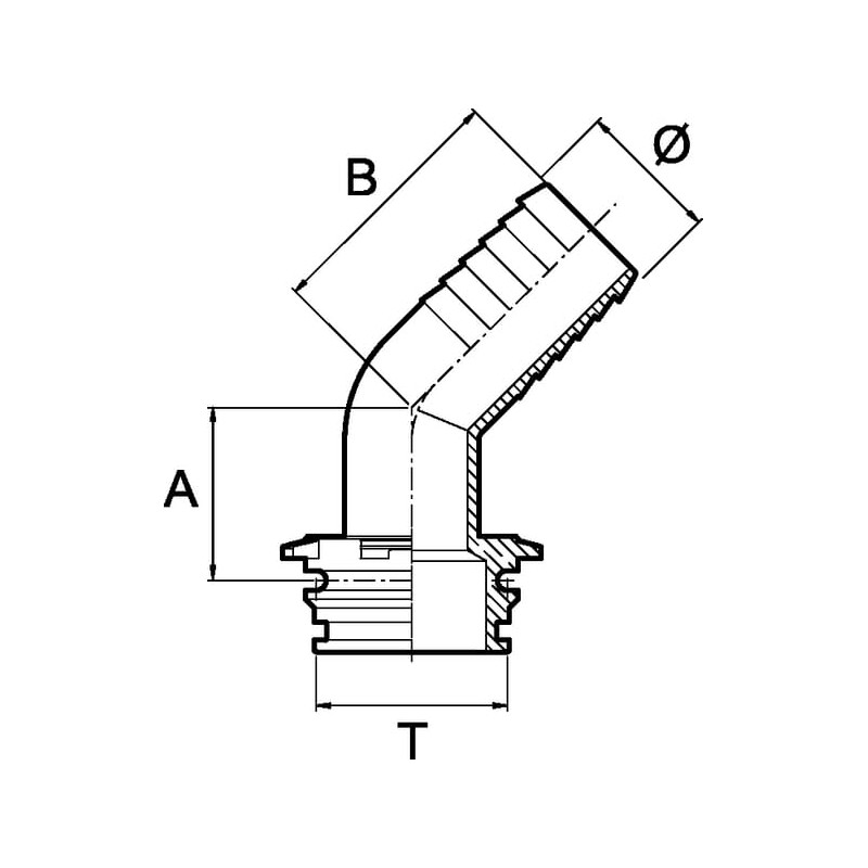 Žarnos jungtis 45° 30 mm su išoriniu sriegiu T5 1193530