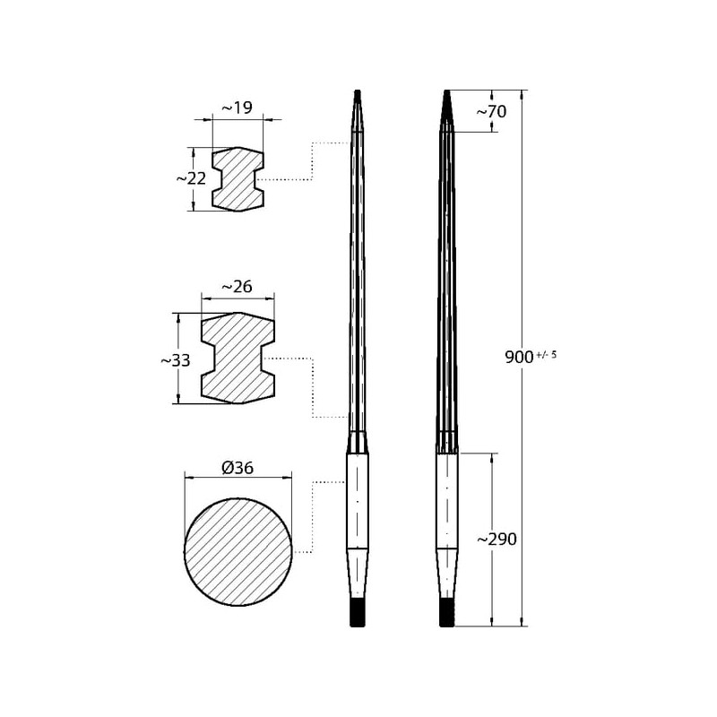 Krautuvo dantis, tiesus, dvigubas T formos profilis 36x900mm, smailus galas su M22x1,5mm veržle, raudonas, SHW FT2S