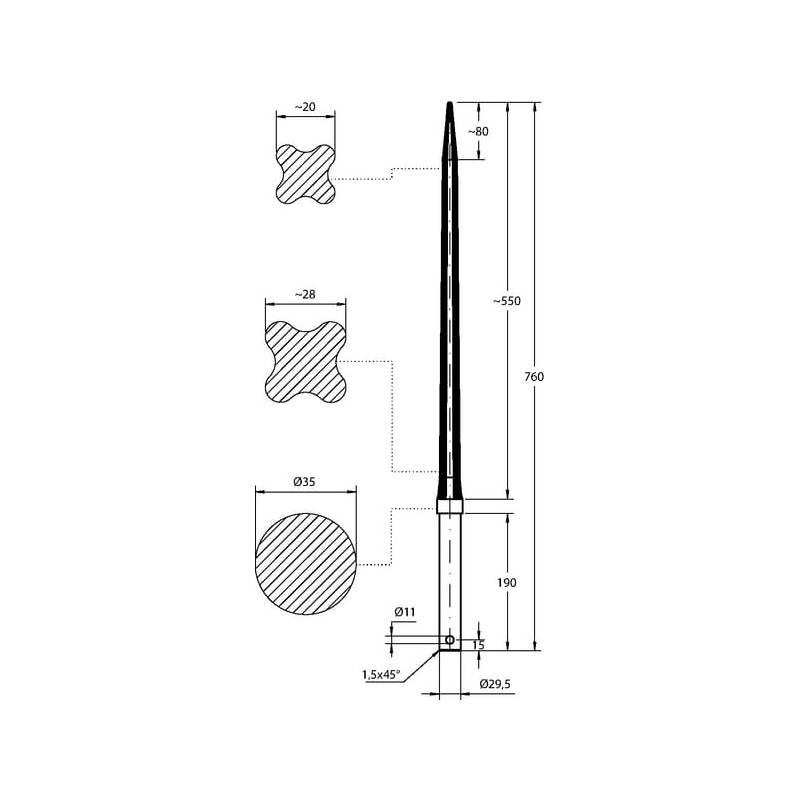 Krautuvo dantis, tiesus, žvaigždės formos, 35x760 mm, smailus galas su Ø11 ritininiu kaiščiu, raudonas, SHW FT53