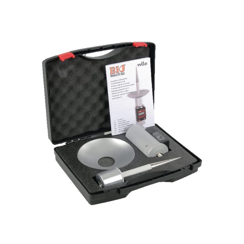 Sudėtyje yra: „Wile Bio“ drėgmės matuoklis, indo formos zondas, naudojimo instrukcija, nešiojimo dėklas.