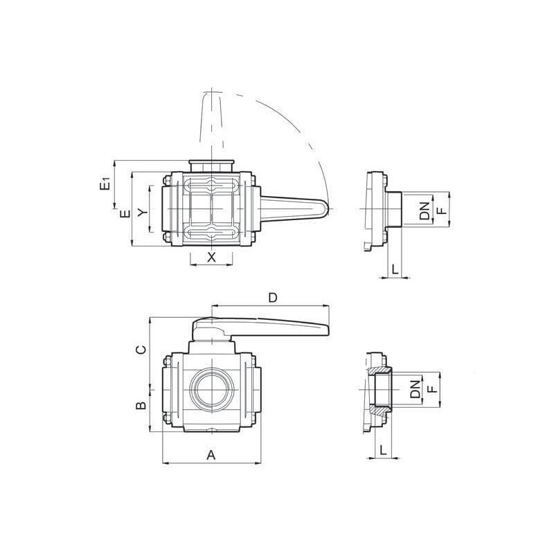 Techninė informacijaSvirtis reguliuojama 90° kampu Rankena yra apvali, kad būtų galima saugiai ir patogiai valdyti Santrumpos „F“ ir „M“ savybėse atitinkamai reiškia vidinį (vidinis sriegis) ir išorinį (išorinis sriegis)