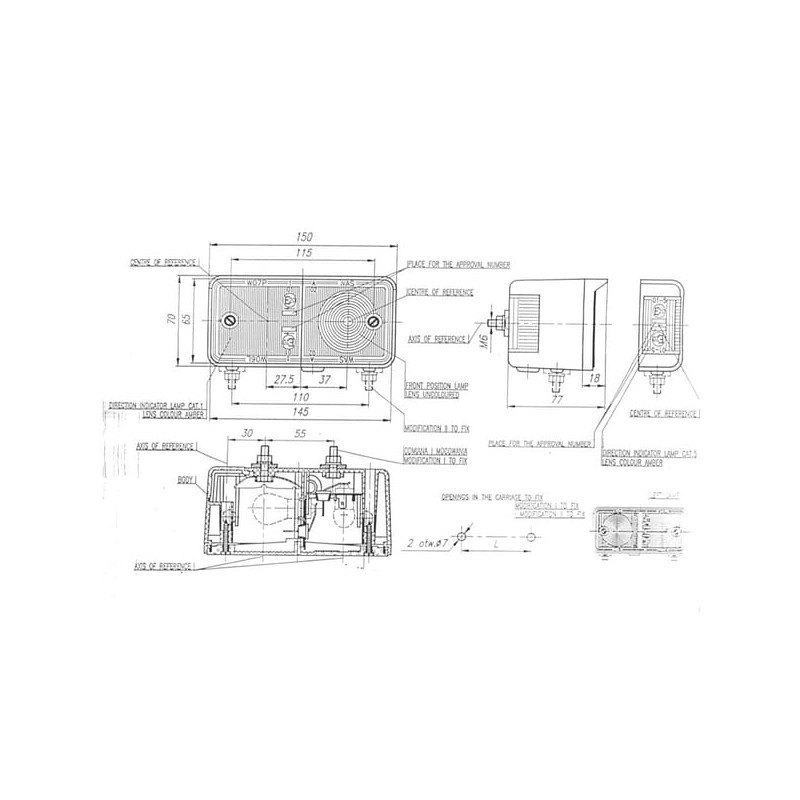 Halogeninis posūkio ir gabaritinis žibintas kairysis, priekinis, 12/24V, gintaro/baltos spalvos, tvirtinamas varžtais, 150x77 mm