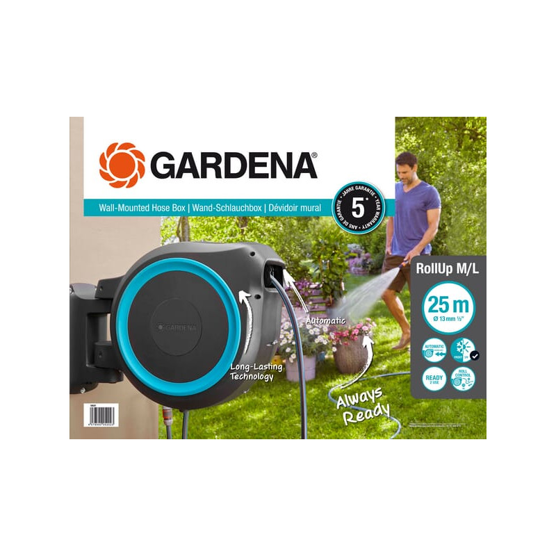 ĮtrauktaSieninė žarnos dėžutė „RollUp M/L“ tiekiama su sieniniu laistymo laikikliu, 25 metrų sodo žarna, lanksčia jungiamąja žarna, visomis reikalingomis originaliomis GARDENA sistemos dalimis ir purkštuvu su dviem skirtingais purškimo nustatymais.